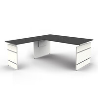 Hoekbureau Office desk 180cm antraciet hoogte verstelbaar. Dit bureau met de afmeting 160x80cm is een ideale werkplek welke je helemaal op je eigen smaak kunt afstemmen. Het bureau is wit met twee grijze inlegstrepen op de zijkant en voor het bovenblad kun je kiezen uit verschillende kleuren. Het hoekgedeelte van 100x60cm kun je zowel links als rechts monteren.