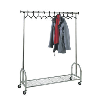 Kapstok Trolley voor jassen en bagage. De staande kapstok Trolley is geschikt voor veel jassen en ook voor bagage koffers en tassen. De staande kapstok Trolley is gemaakt van staal en afgewerkt in chroom. De kapstok heeft een speciaal bagarek en staat op wielen, waarvan twee met rem. Deze royale kapstok Trolley is zowel geschikt voor zakelijk als privé gebruik. De kapstok Trolley heeft kleine zwarte accenten en wordt geleverd exclusief de kleerhangers, deze kun je los bijbestellen per set van 5 stuks.