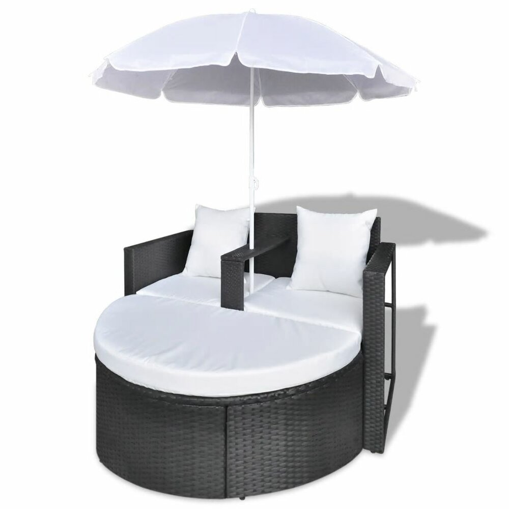 - Zwart wicker loungebed + witte parasol